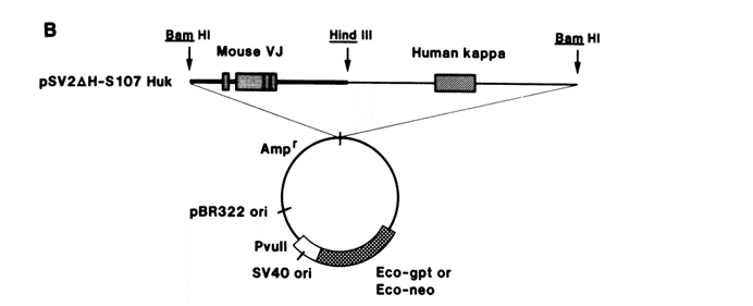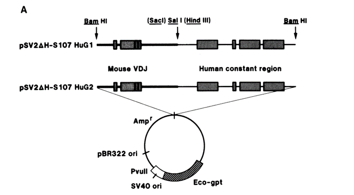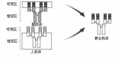 如人鼠嵌合抗体,是由鼠源性抗体的V 区基因与人抗体的C 区基因拼接为嵌合基因,然后插入载体,转染骨髓瘤组织表达的抗体分子。通常是将小鼠可变区外显子(包含抗原结合位点)与人类恒定区外显子(负责抗体的效应功能)融合,构建嵌合免疫球蛋白基因。最终生产一种能够逃脱人体免疫系统监视,减少对人体免疫系统刺激性的新抗体,同时保留小鼠单克隆抗体的特异性。