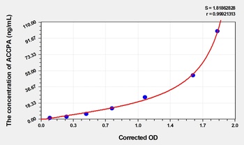 Description | The test principle applied in this kit is Sandwich enzyme immunoassay. The microtiter plate provided in this kit has been pre-coated with an antibody specific to Mouse ACCPA. Standards or samples are added to the appropriate microtiter plate wells then with a biotin-conjugated antibody specific to Mouse ACCPA. Next, Avidin conjugated to Horseradish Peroxidase (HRP) is added to each microplate well and incubated. After TMB substrate solution is added, only those wells that contain Mouse ACCPA, biotin-conjugated antibody and enzyme-conjugated Avidin will exhibit a change in color. The enzyme-substrate reaction is terminated by the addition of sulphuric acid solution and the color change is measured spectrophotometrically at a wavelength of 450nm ± 10nm. The concentration of Mouse ACCPA in the samples is then determined by comparing the OD of the samples to the standard curve. |