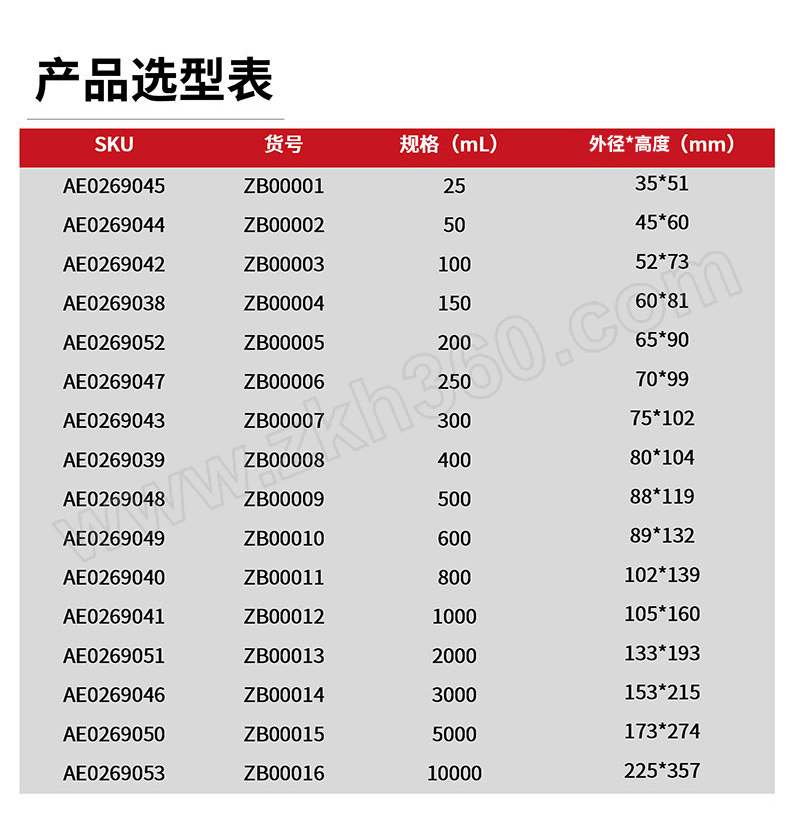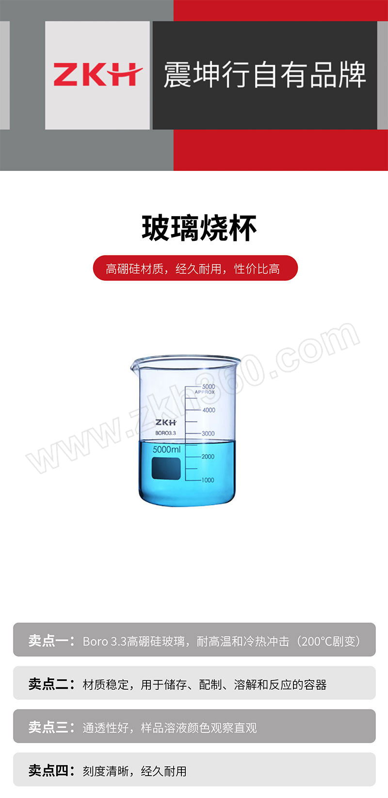 外径:173mm容量:5L型号:ZB00015材质:高硼硅玻璃分度值:500mL包装规格:1只/盒 6盒/箱高度:274mm类型:玻璃烧杯货号:ZB00015销售单位:盒品牌:ZKH/震坤行产品名称:玻璃烧杯箱规:1只/盒 6盒/箱核心规格:5L 1只