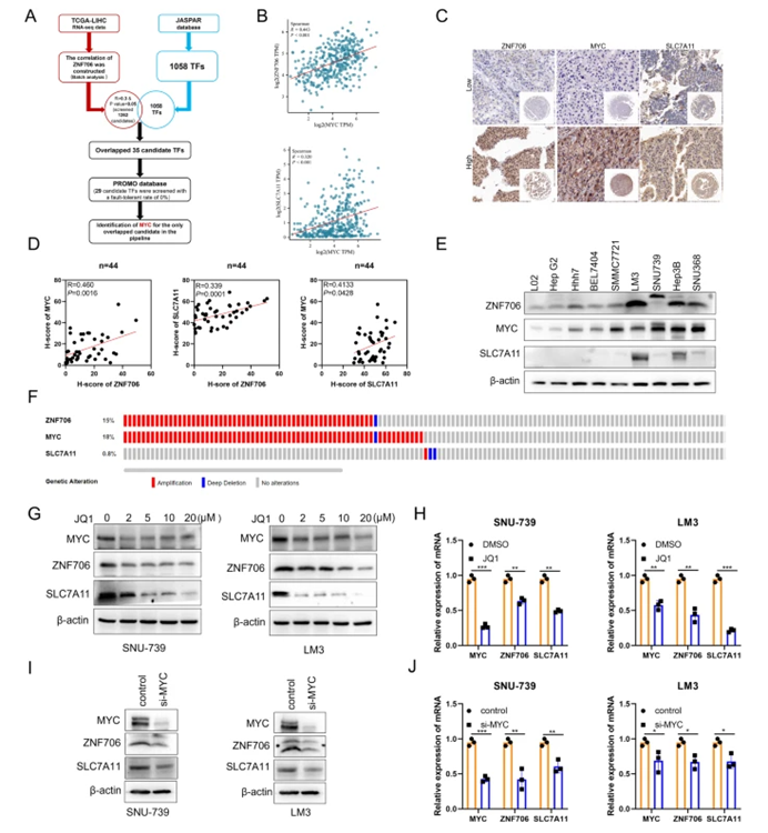 Jie Chu, Jun Jiang, Xin Fan, Jun Liu, Ke Gao, Yu Jiang, Mengxuan Li, Wenjin Xi, Lu Zhang, Ka Bian, Angang Yang & Rui Zhang 染色体8q22拷贝数增加在肝癌中的致癌潜力尚未明确。在此,我们报告,由定位于染色体8q22的基因编码的ZNF706,是一种C2H2型锌指蛋白。然而,ZNF706的生物功能和机制尚未得到深入研究。在临床上,肝细胞癌(HCC)中ZNF706的表达升高,且高ZNF706表达与HCC患者的不利存活相关。功能实验表明,ZNF706的敲低在体外和体内均抑制了HCC的进展。通过RNA测序(RNA-seq)和基于染色质免疫沉淀的深度测序(ChIP-seq)揭示,从机制上讲,ZNF706是一种关键的铁死亡调节剂,且SLC7A11是ZNF706的重要靶标。此外,ZNF706的敲低抑制了SLC7A11的表达,增加了脂质过氧化,并促进了铁死亡。进一步分析表明,ZNF706是HCC细胞中MYC转录激活的新型直接靶标。重要的是,MYC的缺失减少了SLC7A11介导的氧化还原稳态,而ZNF706的重新表达逆转了这一效应。综上所述,我们的数据表明,ZNF706是肝癌中的潜在致癌基因,它通过调节SLC7A11表达来作为铁死亡的调节剂,构成HCC的潜在治疗靶点。 Coordinated expression of ZNF706, MYC, and SLC7A11 in liver cancer