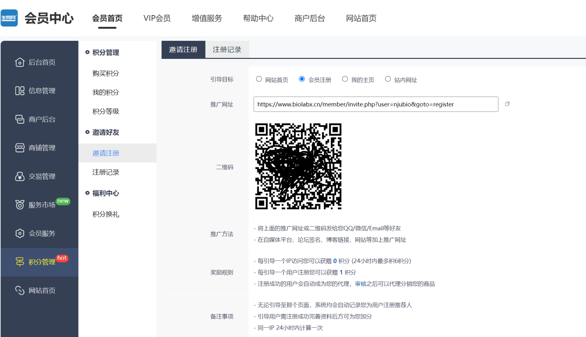 5、会员二维码邀请注册,每邀请一人注册会员,奖励1个积分。