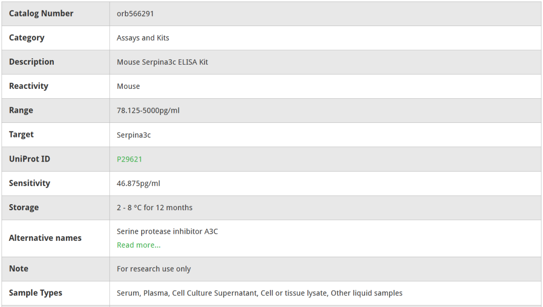 1、Mouse Serpina3c ELISA Kit(orb566291,Biorbyt)
