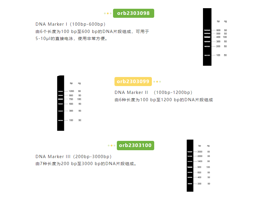 预染蛋白Marker通常由一系列不同分子量的蛋白质组成,这些蛋白质经过特殊的染色处理,以便在凝胶电泳过程中能够直接观察到清晰的条带。其核心组成部分包括: 1. 多种标准蛋白:一般包含了从低分子量到高分子量不同范围的多种高度纯化的天然蛋白质,每种蛋白质都有其特定的分子量,共同构成了一个涵盖广泛分子量区间的标准体系。例如,常见的产品中可能包含从 几kDa 到 几百kDa不等的蛋白质,以满足不同实验对分子量检测范围的需求。 2. 预染标记物:这些蛋白质被预先染上了特殊的染料,使得它们在电泳过程中能够直接呈现出可见的条带,无需像传统蛋白分子量标准那样在电泳后再进行额外的染色步骤。常用的染料具有良好的稳定性和清晰度,能够确保条带在凝胶上清晰可辨,且在不同实验条件下保持稳定的颜色和强度。 3. 缓冲液及添加剂:产品中还配备了合适的缓冲液,用于维持蛋白质的稳定性,并在电泳过程中提供适宜的离子环境。此外,还会添加一些保护剂和稳定剂,以防止蛋白质在储存和使用过程中发生降解或变性,确保产品在有效期内保持良好的性能。蛋白质阶梯以即用型形式提供,可直接加载到凝胶上;使用前无需加热、减少或添加样品缓冲液。 DNA Marker,又称为 DNA 分子量标准或 DNA ladder,是一系列已知长度的 DNA 片段的混合物。这些 DNA 片段经过精心挑选和制备,其长度信息精确可知。它们如同标准尺码的尺子,在 DNA 相关实验中,用来衡量未知 DNA 片段的大小。一般用于PCR 产物鉴定,DNA 酶切分析,核酸测序,Southern 杂交等实验中。 DNA Marker 的作用原理