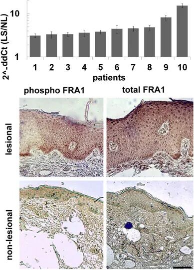 图1.银屑病患者病变皮肤中FRA1过表达。使用qPCR评估相同患者的病变和非病变皮肤中FRA1的表达。a、 与相同患者的非病变皮肤样品相比,病变皮肤中FRA1基因的表达(平均值 ± 标准差,p < 0.05)b.银屑病皮肤病变和非病变活检中FRA1蛋白丰度的免疫组织化学分析。左面板–针对磷酸-FRA1的抗体;右图–针对非磷酸FRA1的抗体(5对皮肤的代表性照片)。