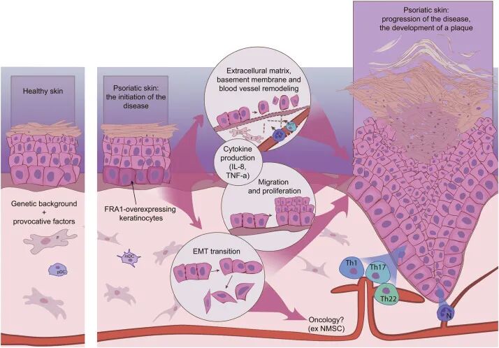 银屑病是一种免疫介导的皮肤病,影响世界人口的约2-3%。银屑病最显著的特征是皮肤病变,其表现为表皮细胞过度增殖和异常分化的区域,以及免疫功能的改变和皮肤血管化的增强。银屑病是一种复杂的病理学,为了确定导致疾病发展的关键分子改变,人们对其进行了积极的研究。随着时间的推移,该疾病的中心范式从角质形成细胞特异性改变转变为银屑病皮肤中的脂质改变,从免疫细胞群改变转变为屏障异常或皮肤微生物组的改变。对银屑病相关细胞因子和免疫特性的深入研究,在认识到病理是由Th17免疫细胞过度激活以及免疫特性的其他改变所驱动方面取得了重要突破。因此,开发了一种新的治疗方法——“生物药物”,如针对TNFa或白介素阻滞剂的抗体(ustekinumab、secukinumab、ixekizumab、guselkumab)。然而,角质细胞似乎是疾病的重要中间体,不仅负责可见的皮肤表现和结构变化,还参与许多银屑病相关细胞因子、趋化因子和抗菌分子(IL-1α、IL-1β、IL-6、IL-8、IL-23、TNF-α、S100A8、S100A 9)的产生。角质形成细胞改变的疾病小鼠模型强调了角质形成的作用,如组成性活性Stat3表达、诱导性S100A7/A15过表达或导致银屑病样表型的Jun蛋白的诱导性表皮缺失。此外,最近对与疾病发展相关的CARD14突变的研究强调了角质形成细胞信号在病理学中的重要性。不应低估角质形成细胞在银屑病皮肤表现中的作用-这类细胞能够产生许多银屑病相关的细胞因子、趋化因子和抗菌分子,在疾病进展过程中介导免疫细胞主动迁移到病变部位。此外,即使在成功治疗和疾病稳定缓解后,前病变区域的皮肤细胞仍以基因表达改变为特征,即疾病的“分子疤痕”。如果通过角质形成细胞增殖和迁移的异常激活以及ECM重塑和伤口愈合的改变来表征银屑病,则发现其与上皮-间充质转化(EMT)的终点相似。EMT是导致上皮细胞表型和生理变化的一系列分子改变。EMT的一个定义特征是分化的上皮细胞的转分化,导致上皮表型和细胞极性的丧失,从而获得间充质表型。它广泛发生在癌症侵袭和转移、炎症应激以及伤口愈合和胚胎发育等正常生理过程中。EMT转换是否在银屑病中起任何作用是一个重要的问题。最近的研究表明,许多EMT标志物的特征是银屑病角质形成细胞中的表达谱改变(即波形蛋白(VIM)、纤维连接蛋白(FN)、纤溶酶原激活物抑制剂1(SERPINE1)、细胞角蛋白10(KRT10)等)。促炎细胞因子和趋化因子基因表达以及角质形成细胞增殖的主要调节因子之一是转录因子AP-1。表皮中AP-1蛋白(JUN、JUNB、JUND、FOS、FOSB、FRA1、FRA2)的表达模式因表皮层和角质形成细胞的分化状态而异,这意味着AP-1在角质形成细胞增殖和分化的调控中起着重要作用。敲除小鼠角质形成细胞中AP-1超家族的各种成员导致表皮稳态的破坏。例如,JunB−/− 小鼠的特征是IL-6和G-CSF的表皮生成增加、皮肤溃疡和伤口愈合受损,而Jun和JunB可诱导表皮失活的小鼠出现银屑病表型等。作者先前的研究表明,FRA1是银屑病患者病变皮肤中最明显的过表达AP-1蛋白。该蛋白广泛与不同类型的癌症相关,最近的研究表明,它是大肠细胞和前列腺上皮细胞中EMT相关基因表达的重要调节器。为了评估FRA1介导的转录调控在银屑病角质形成细胞中的重要性,作者创建了FRA1过表达角质形成的细胞系HaCaT-F,并评估了它们的银屑病相关特征。