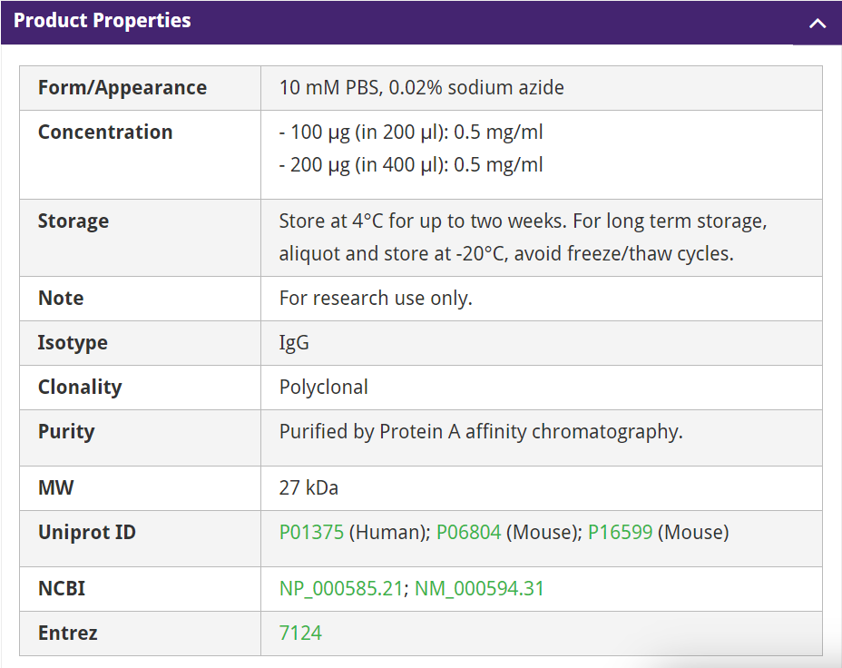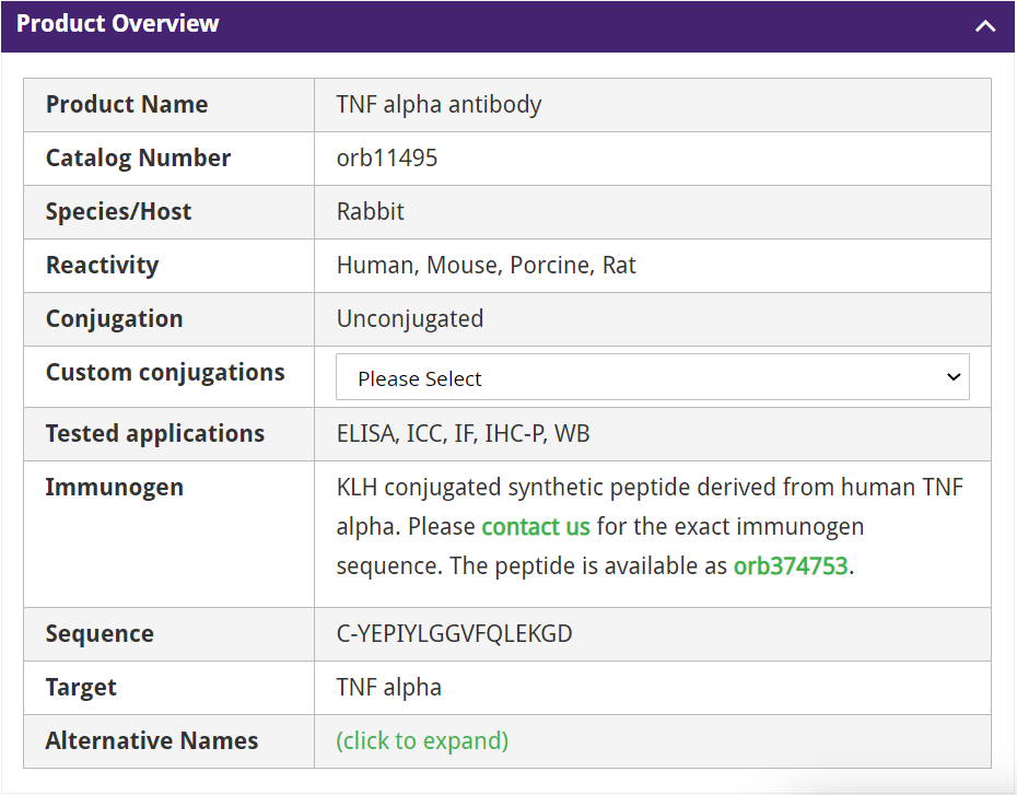 上述炎症分析,在免疫荧光,蛋白质印迹实验过程中,用到一抗TNF alpha 抗体(#orb11495,Biorbyt)。