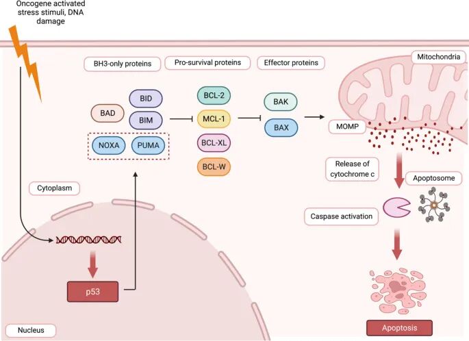 当遇到各种应激刺激,如营养或生长因子剥夺、氧化应激、γ射线照射和不同细胞毒性药物的治疗,导致通过不同的转录或转录后过程增加促凋亡BH3蛋白(如 PUMA、NOXA、BIM、BID、BAD)的水平。例如,PUMA 和 NOXA 的基因被肿瘤抑制基因 TP53/TRP53 直接转录激活(在红色虚线框中表示)。