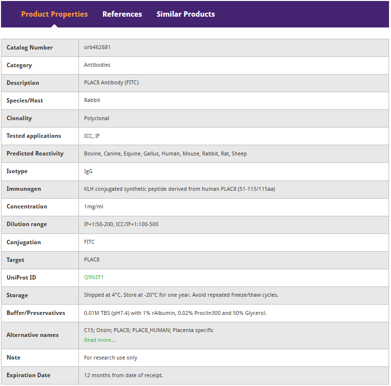 1、兔多抗 PLAC8 Antibody (FITC)(orb462681,Biorbyt)