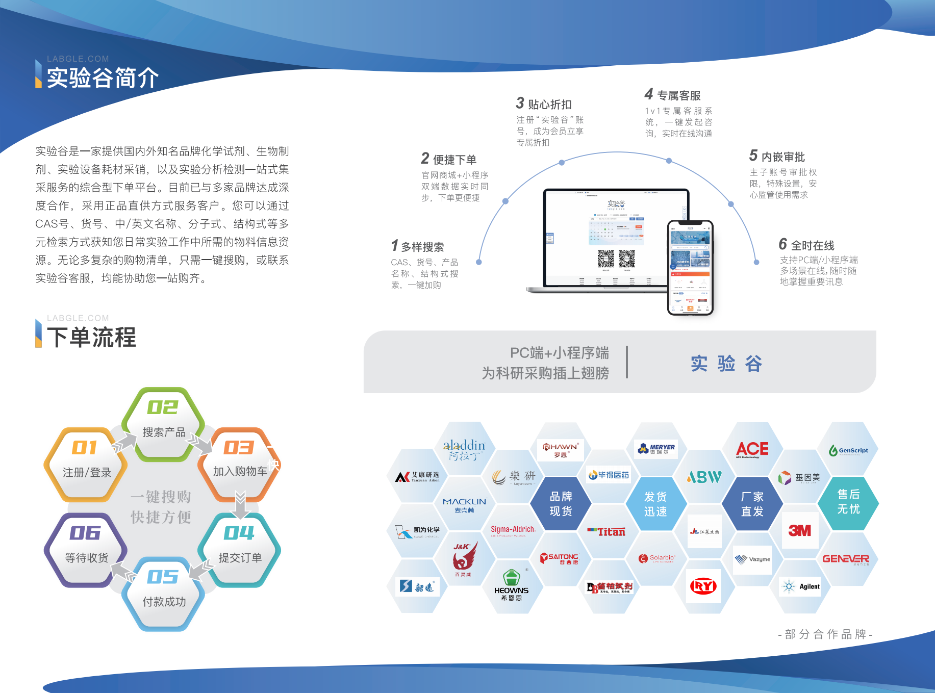 实验谷,一站式科研采购服务平台,致力于为您提供便捷、高效的采购体验。我们汇聚了国内外众多品牌,为您提供zheng品直供的化学试剂、生物制剂、耗材设备以及分析检测等一站式服务。在这里,科研人员无需再在多个供应商网站之间来回切换,无需为了采购不同类型的科研物品而四处奔波,只需在实验谷平台上进行一次操作,就能轻松完成多种物品的采购。