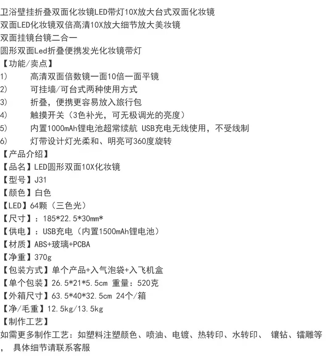 双面挂镜台镜二合一LED化妆镜 10X放大台式双面美妆镜