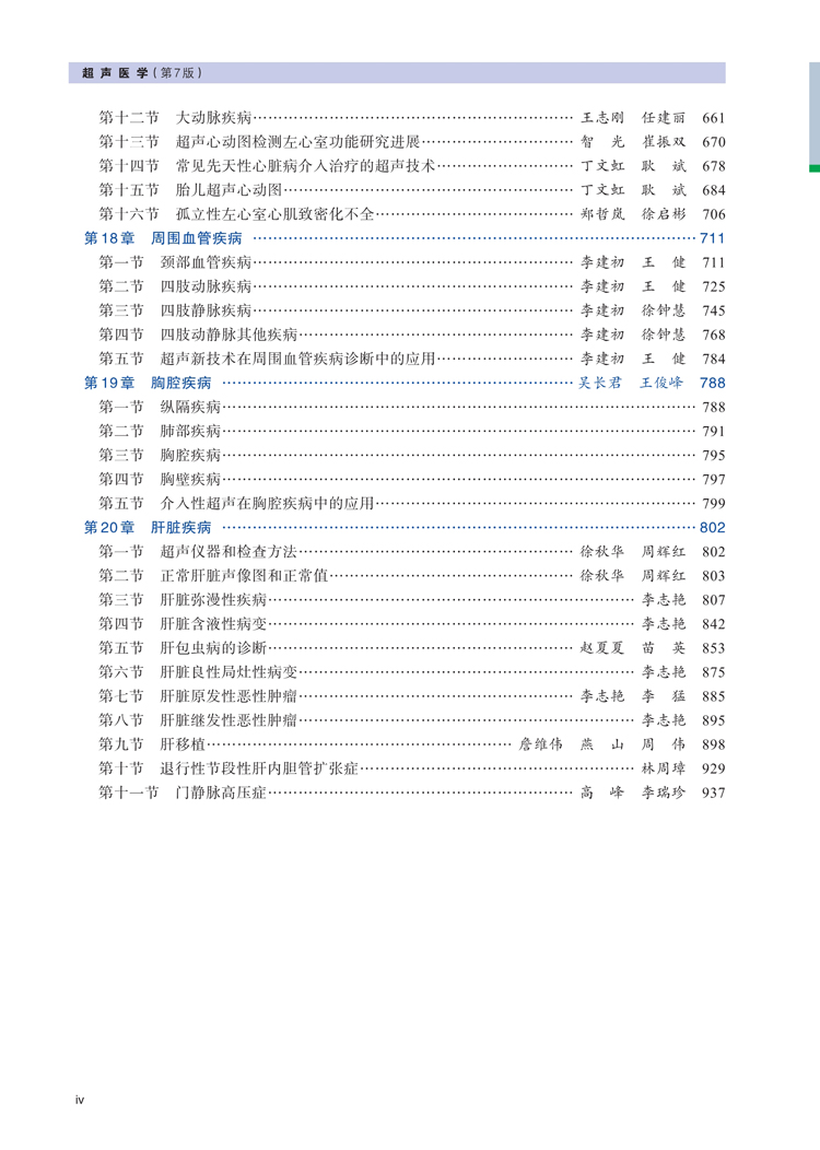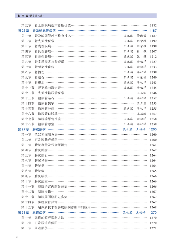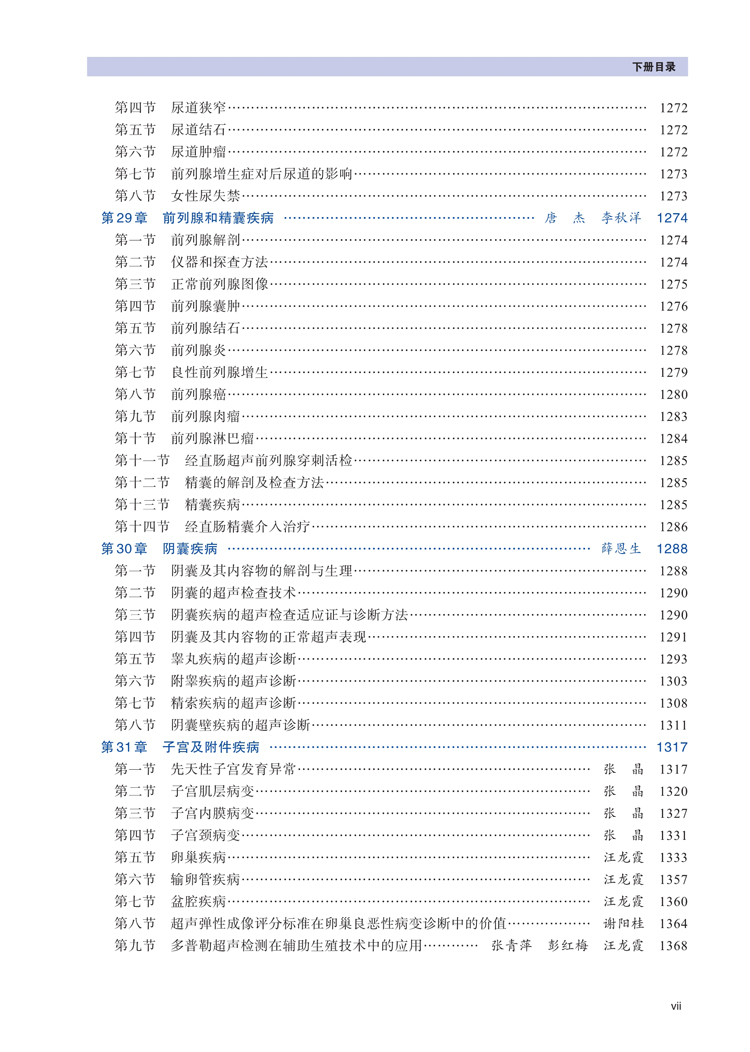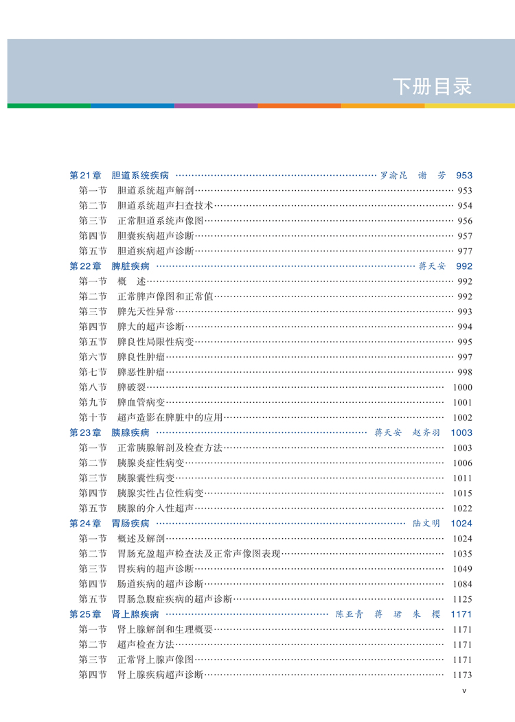 篇超声诊断,按照解剖部位论述了颅脑疾病、眼部疾病、颌面部疾病、甲状腺与甲状旁腺疾病、乳腺疾病、浅表淋巴结疾病、心血管疾病、周围血管疾病、胸腔疾病肝脏疾病、胆道系统疾病、脾脏疾病、胰腺疾病、胃肠疾病、肾上腺疾病、肾及输尿管疾病、膀胱疾病、尿道疾病、前列腺和精囊疾病、阴囊疾病、子宫及附件疾病、正常妇娠超声表现、异常妊娠子宫、肌肉骨骼系统疾病、腹膜后疾病等,专门论述了小儿疾病。