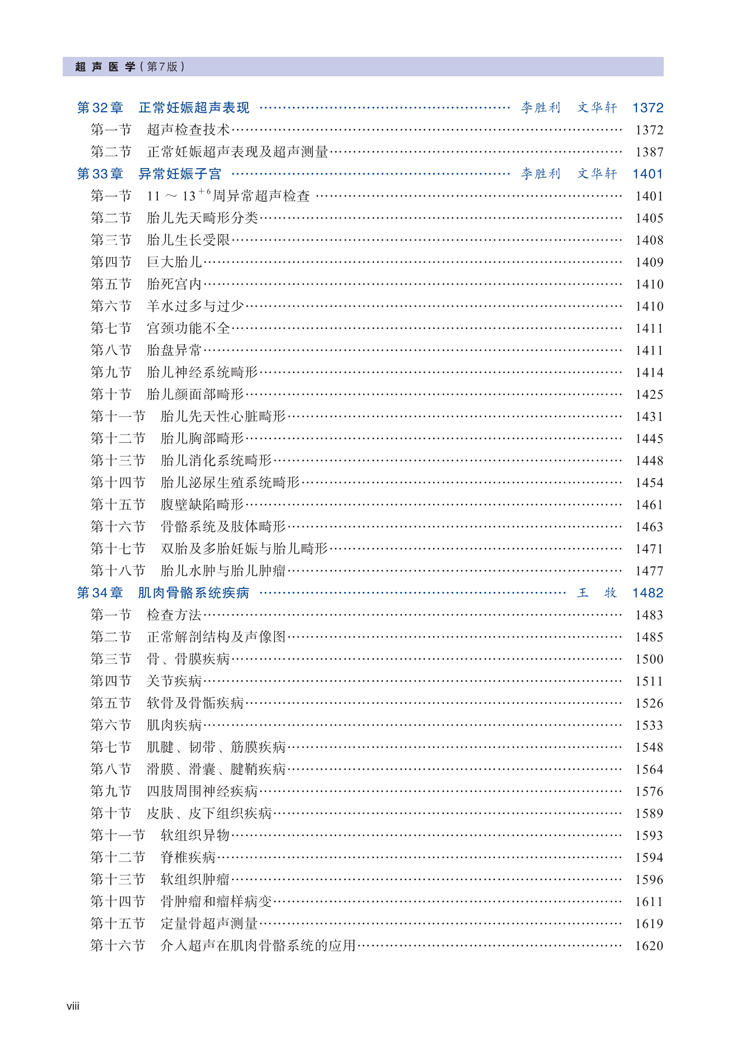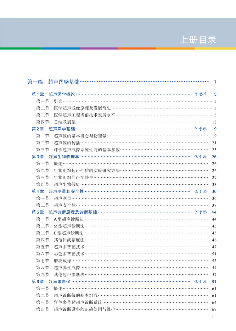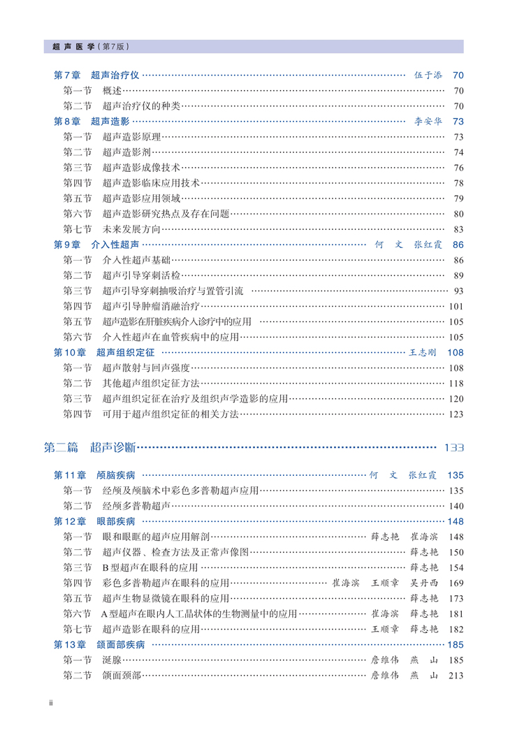 篇超声医学基础,阐述了超声医学概论、超声声学基础、超声生物物理学、超声测量和安全性、超声诊断原理及诊断基础、超声诊断仪、超声治疗仪、超声造影、介入性超声、超声组织定征。